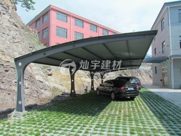 第1、2兩種布局方式的鋼支承有些不可避免地放在頂蓋內部,因為池頂加罩后使其內部腐蝕性氣體濃度成倍增加,在陽光輻射下溫度很高,內部的鋼布局很容易腐蝕,通常壽數在3~5年,即在短時間內就面對整個布局工程的二次建造。膜布局雨棚廠家認為,實踐證明即使是鋼構選用不銹鋼原料,在腐蝕性環境中耐久性仍得不到確保,并且本錢十分高。而第3種膜系統成功處理了這個難題,充分發揮了膜結構車棚本身的優勢。